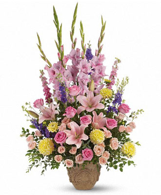 At our shops, we offer the Ever Upward Bouquet by Teleflora, which is a popular choice among our customers. This feminine arrangement exudes beauty and grace and is presented in a stunning Garlands of Grace Urn.